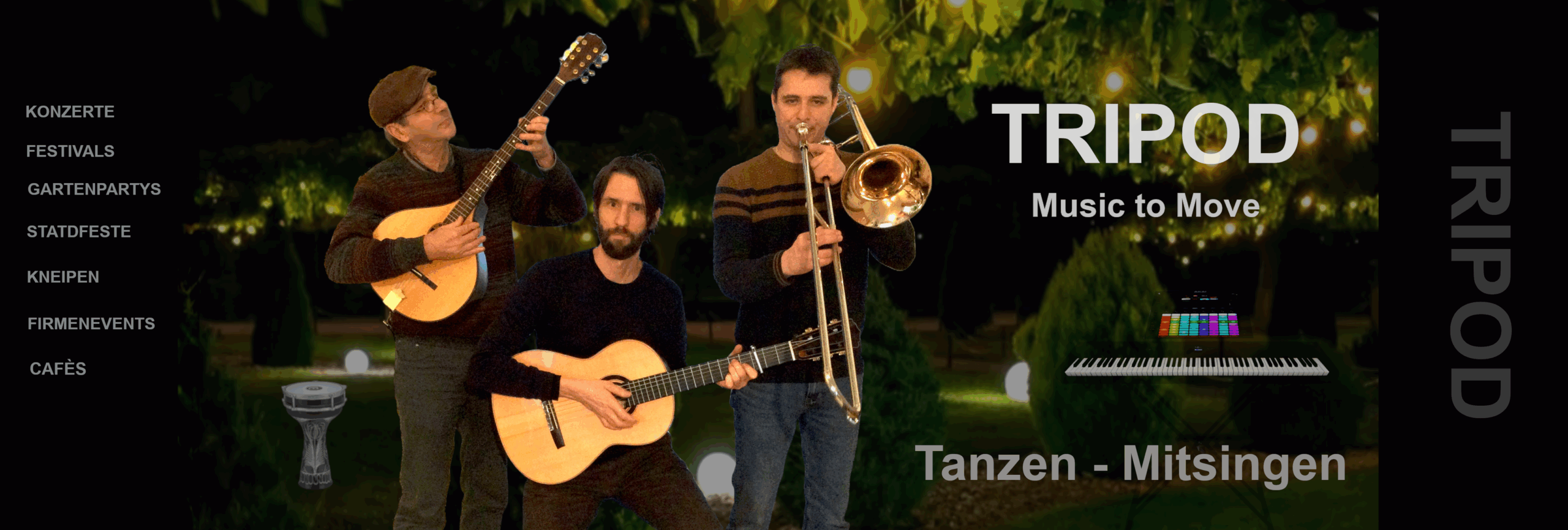 Die Formation TRIPOD aus Karlsruhe spielt selbst komponierte und arrangierte Global Pop Music . Wir lassen uns von Musik aus aller Welt, von Rock, Pop, Folk und Jazz und anderen Genres inspirieren und schaffen daraus eigene Lieder und Klangwelten.